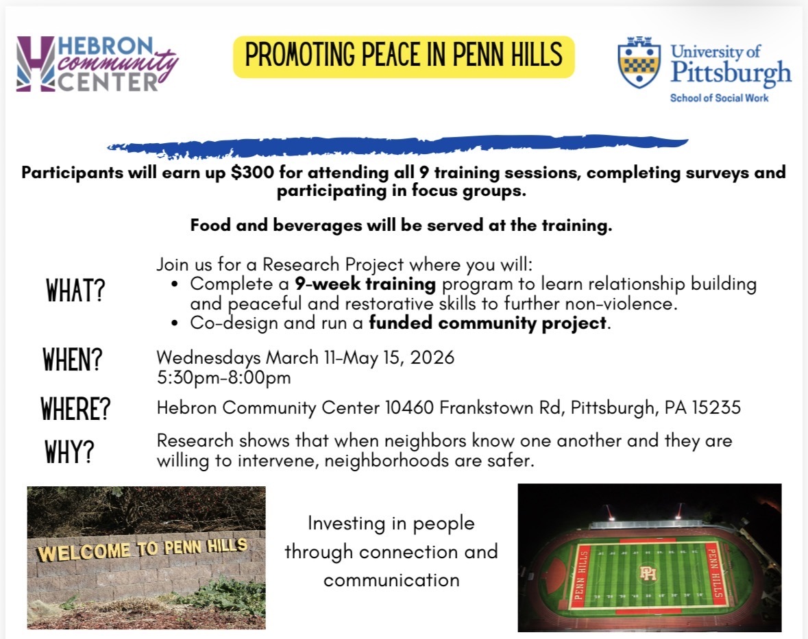 Our Partnership: HCC serves as the Penn Hills Community Partner—supporting resident surveys and facilitating anti-violence training cohorts.